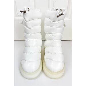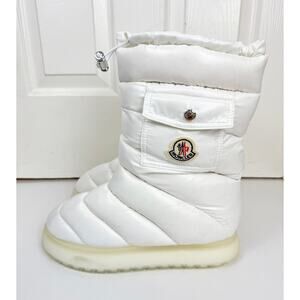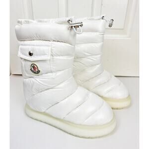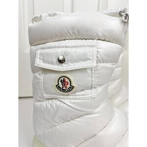Description: Moncler "Gaia Pocket" snow boots in down-filled laminated nylon. Round toe. Side flap pocket with logo. Drawstring at collar. Pull-on style. TPU sole. PVC outsole. Nylon lining. Made in Italy.