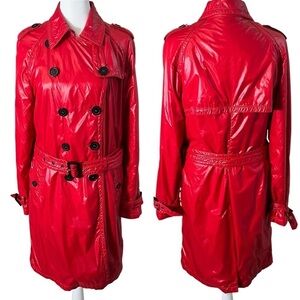 Authentic MONCLER Y2K Shiny Nylon Double Breasted Trench Coat Jacket. Large branded black buttons. Detachable waist belt with branding. Vibrant red shiny nylon material. Side pockets. Extra buttons galore. Fully lined. From the early 2000s. Moncler Size 2 = US M according to size chart.