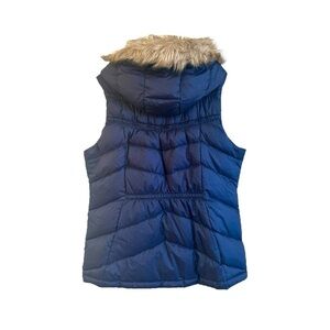 MONDETTA, WOMENS, QUILTED PUFFER VEST. HOODED WITH FAUX FUR TRIM. ZIP FRONT CLOSURE. 2 ZIP-UP POCKETS. DARK BLUE COLOR. IN NEW CONDITION. SIZE L