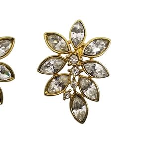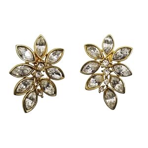 Beautiful vintage earrings from the 1980s by Monet. Earrings are goldtoned with marquise cut white glass rhinestones. Earrings have a floral or foliage style design. They measure approx. 1-1/4 inches tall and 1 inch wide. Earrings have stud backs and are stamped Monet near stud, great condition