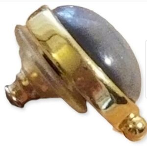 Beautiful earrings by Monet are goldtoned with large pearlescent blue gray faux moonstone detail. Earrings are oval shaped with gold ball detail at bottom of earring. Earrings are stud style and marked Monet at base of stud. Earrings measure 3/4 inch in length and 1/2 inch in width.