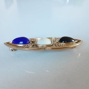 MONET Art Deco style, vintage-inspired brasstone pin/brooch embellished with 3 faux stones: one in cobalt blue (tear-shaped), the center one in off-white/cream (rectangular), and another in black (tear-shaped). Brooch has an interesting shape that can be worn horizontally or vertically. Stones have dimension to them--they are slightly raised. Locking C-clasp; marked with "MONET." Very good pre-owned condition.