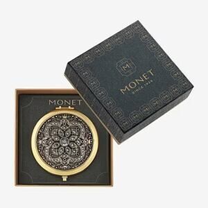MONET Compact Mirror Gold Tone Rhinestone Filigree New in Box