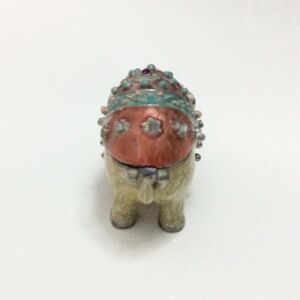 Featuring a multicolor design with a glossy finish, this figural elephant box has lovely details with an ornate blanket on his back and a purple rhinestone in the center of his cap adding to its overall beauty. This small box is perfect for storing your favorite tiny trinkets, or pills. The box has a magnetic closure and an asymmetrical shape with a trunk-up design. The elephant shape and multicolor design make it a great addition to any collection, especially those with a circus theme. This item is a must-have for any collector or lover of elephants or just a beautiful piece to collect! Get your hands on this beautifully designed trinket box today and add it to your collection!