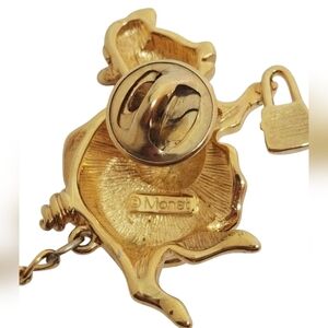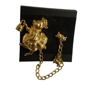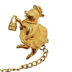 Adoreable vintage double pin brooch by Monet featuring a mama pig dressed for the market and her baby piglets. Brooch has two pins with chain connecting them. The first pin is on the backside of the mama pig and the other pin is at the end of the chain on which the piglet charms hang. Mama pig measures 1-1/2 inches tall and 1-1/4 inches wide and total length of piece including chain is 4-3/4 inches. Brooch is in very good condition however it is missing two piglet charms on the chain.