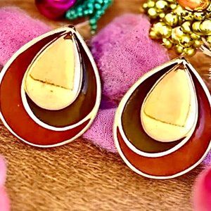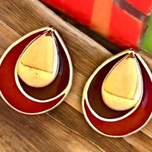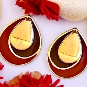 Elegant vintage 1980s Monet earrings. These lovely earrings are a classic color combination of the 80's decade. Considered bold and aggressive, the red and black statement - and especially with gold color - is reminiscent of the 1980's power-dressing. Nothing flowery, feminine or dangling here. The earrings are dramatic in a blood red enamel with a swiel of black enamel and a gleaming goldtone teardrop shape and goldtone edges.