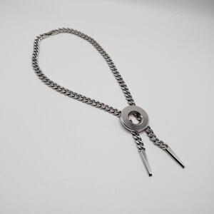 This is a striking vintage MONET necklace with a bold modernist design. It features a heavy silver tone chain connected to a circular centerpiece with two pointed drop accents. The necklace has a sleek and contemporary mid-century feel, making it perfect for modern styling or designer vintage collectors.
