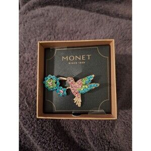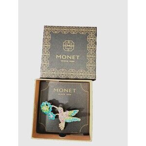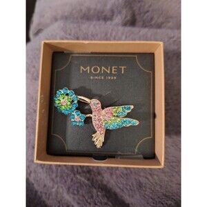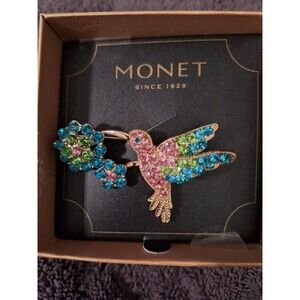 Vintage Monet Hummingbird Pin W Pink, Blue Green Crystals. Gold Tone Setting. NEW D-1