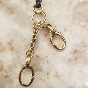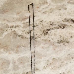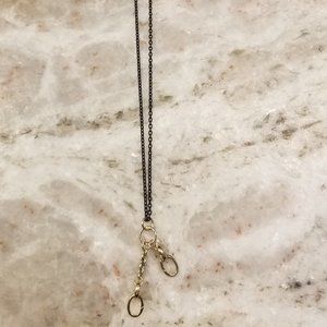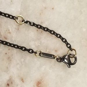 The 18" chain is made of Monica's signature Black Steel. It has an 18K loop at 17" for versatility. The two 18K Yellow Gold Charm Stations are a length of 1 5/8".