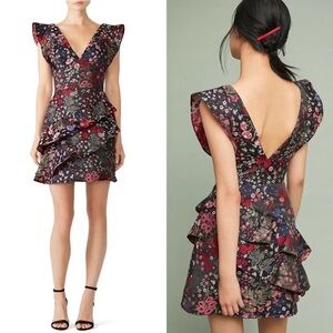 MONIQUE LHUILLIER Floral Embroidered Flutter Sleeve Tiered Ruffle Mini Dress 16