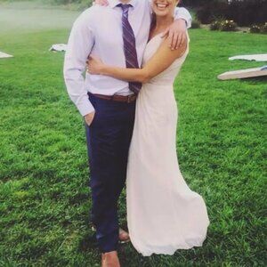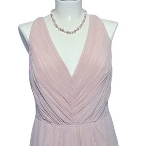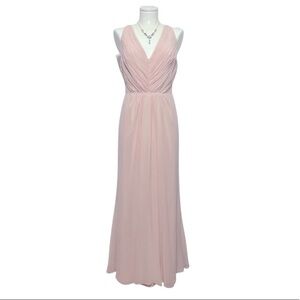 Ethereal blush pink chiffon sleeveless v neckline gown with hidden back zipper and hook-and-eye closure, matching sheer blush pink chantilly lace insets at sides and back, shirred bodice in front and shoulder blades, flowy chiffon skirt designed to flatter most figures. 100% polyester chiffon, front bodice and skirt are lined with silky 100% polyester. Gorgeous dress for a wedding, prom or formal event!