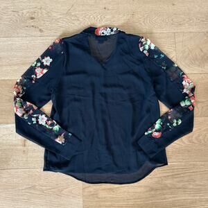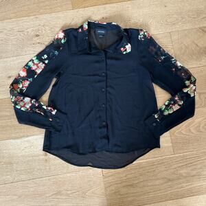 MONKL - Floral Sleeve Sheer Button front Blouse in Black & Pink