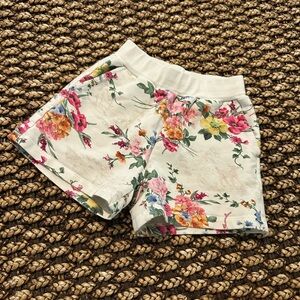 Pretty ivory cotton shorts for girls by Italian brand Monnalisa, with a colourful print of flowers, beige Toile de Jouy pastoral scenes and red logos. Ideal for relaxing in, they are made in comfortable jersey, with jetted side pockets and an elasticated waistband.