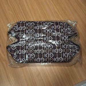 - stylish brown makeup bag with white monogram pattern