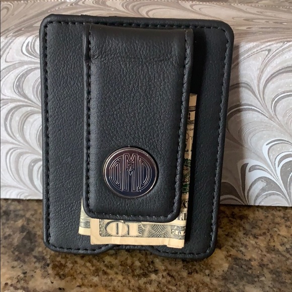 Slim black money clip card holder with a round silver three letter monogram DMD, although it could also just be a large M. Magnetic money clip, two card slots and a inside slot for ID etc. Only a half inch wide. Measures 4”x 3”. New in black box.