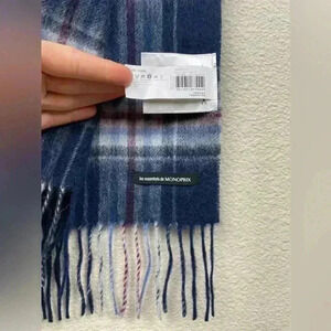 MONOPRIX Unisex One Size 100% Wool Fringe Scarf Blue Plaid Minimalist Essentials