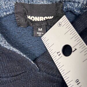 MONROW super soft long-sleeve thermal material cropped hoodie. Relaxed, stretchy fit. Raw edge bottom and heather blue lined hood and cuffs.