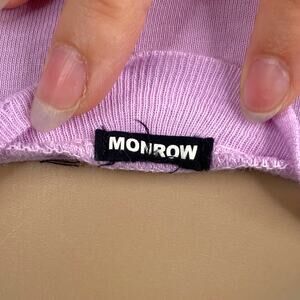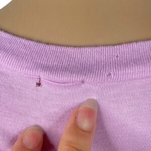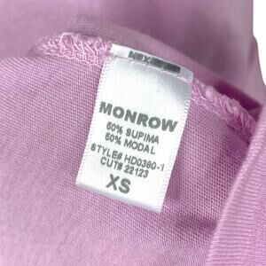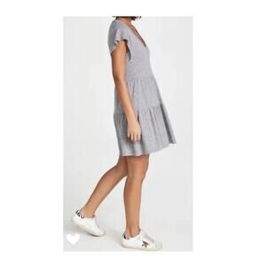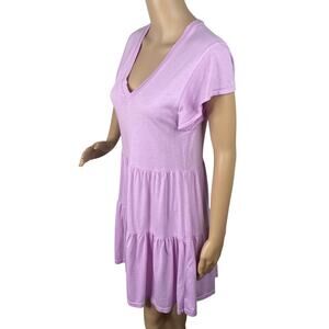 This dress by Monrow is a pullover style, made with a lightweight jersey and has a tiered skirt. Dress is a pastel purple color with v-neck and short flutter style sleeves. Fabric is a soft modal and supima cotton blend. There are a couple of small holes on the back near neckline (see pic, one on the corner of tag where it was pulling, others from tag). Dress is in otherwise excellent condition! Little wear on fabric.