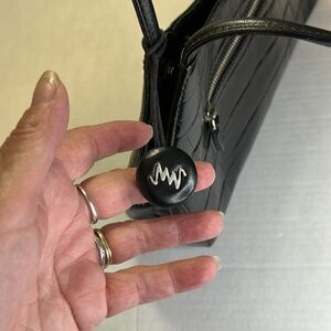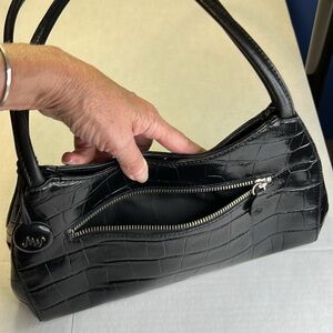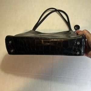 MONSAC alligator crocodile embossed , leather handbag, shoulder bag, black metal feet on bottom preowned excellent condition, snap for wider opening fixed top rolled handles Silvertone hardware exterior zipper pocket on one side, interior, one side pocket and a zip pocket on the other, a Monet hanging charm, black fabric lining checkout pics comment with any questions