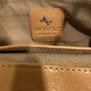 Vintage 90s Y2K Monsac Original tan genuine leather clutch purse. Silver hardware, horizontal silver studs across top front. "MONSAC" detail on turn lock closure. Lightweight, "MONSAC" logo throughout inside lining ,zipper inner Pocket. Designer. Dust bag included. Like new used once.