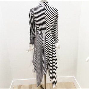 Monse shows a contemporary take on chic style with this silk-twill dress. The asymmetrical hemline and angular stripes accentuate the modern effect, while a shirt dress-style buttoned front and exaggerated cuffs add a refined touch. Material: 100% silk lining: 100% silk care instructions: dry clean. Made in Italy self-tie collar, belt loops, detachable belt, buttoned cuffs.