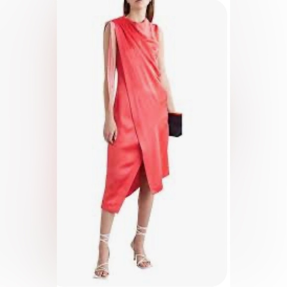 asymmetric dress, satin, solid color, bow-detailed, draped, draped neckline, sleeveless, unlined, zipper fastening, without pockets