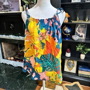 Vibrant tropical print top with adjustable straps. Perfect for a sunny day out.