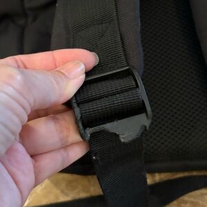 Pre-owned in great condition with no stains but has some normal wear. One buckle on the strap is broken and the other buckle has some chipping as shown in pictures. Also, there’s a tiny rip on one side of the flap. With all the flaws, the backpack is still functional. Stylish and durable, the black backpack is perfect for everyday use. Featuring a sleek design with adjustable straps, this bag combines functionality with a bold look. Can be unisex. Comes from smoke and pet free home.