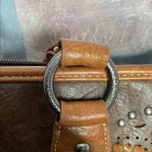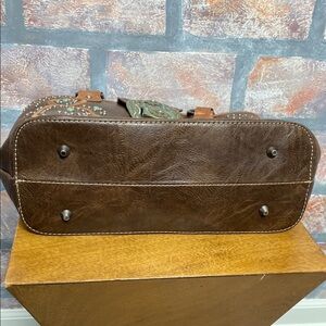 This medium-sized tote bag features a rich dark brown leather-like material with a structured rectangular shape. It is designed with two short handles and showcases intricate lighter brown and tan embroidery that creates swirling patterns across the front.