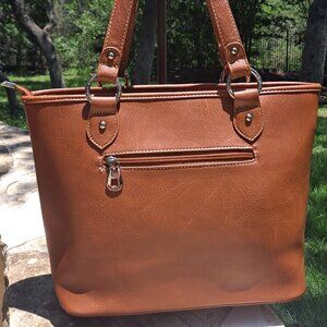 • This western tote is: Made of synthetic leather, has cut-out boot scroll with stitch detail, accented with sliver & crystal studs & seafoam backdrop, has a top zipper