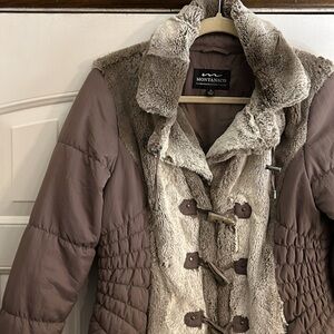 Montanaco brand faux fur detailed jacket size medium. Zip & button front. Faux fur on front and back. Fitted through waist. So cute !! Grayish/brown color. (1)