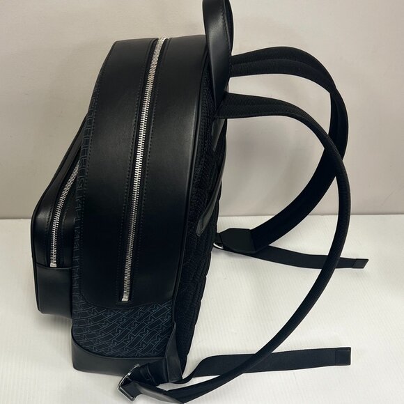 This Montblanc backpack is a stylish and functional accessory for any man. With a geometric pattern in black and blue, it features a zip-around closure and adjustable shoulder straps for comfortable carrying. The bag is made of leather and has a canvas lining, with outer pockets for added convenience. It is lightweight and water-resistant, making it suitable for travel, workwear, business, and casual occasions. The limited-edition design is handmade in Italy and comes with a 11-inch width, 15-inch height, and 6-inch depth. The bag is medium size.