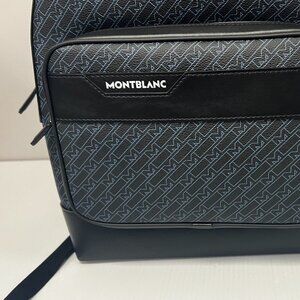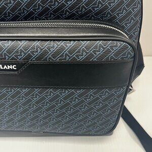This Montblanc backpack is a stylish and functional accessory for any man. With a geometric pattern in black and blue, it features a zip-around closure and adjustable shoulder straps for comfortable carrying. The bag is made of leather and has a canvas lining, with outer pockets for added convenience. It is lightweight and water-resistant, making it suitable for travel, workwear, business, and casual occasions. The limited-edition design is handmade in Italy and comes with a 11-inch width, 15-inch height, and 6-inch depth. The bag is medium size.