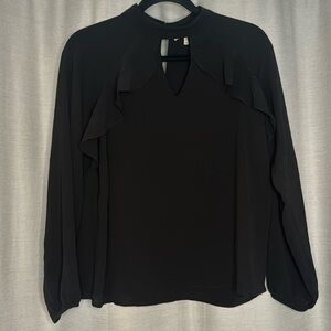 STYLE: Monteau black chiffon key hole long sleeve blouse, perfect for the office, ruffle details, cinch sleeves