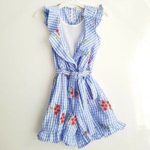Embroidered flowers highlight this pretty gingham romper by Monteau, featuring playful ruffle trim.