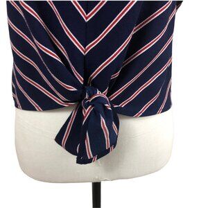 Monteau striped flutter sleeve top. Blue with red and white stripes. Keyhole opening in back. Ties in front.