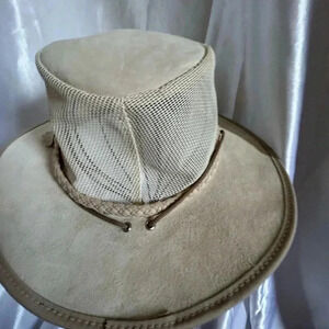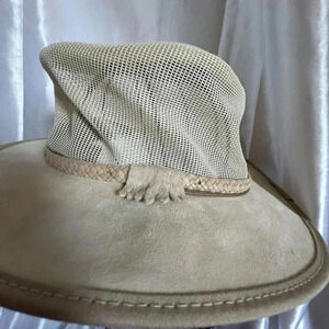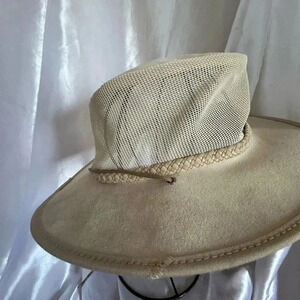 MONTEREY BAY MENS TAN SUN HAT LONG CORDED CHIN STRAP MESH LIKE VENTILATED TOP SUEDE LIKE BRIM GOOD CLEAN CONDITION