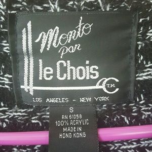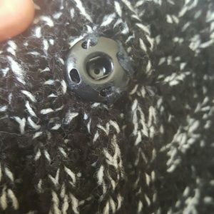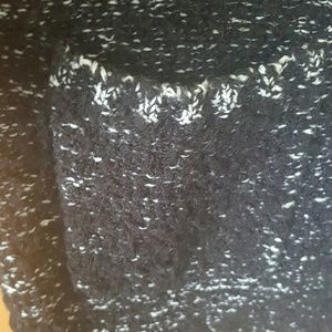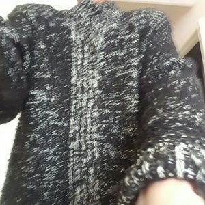 Unusual vintage long boucle sweater-coat. Wear open, partly open or completely closed. Roll up sleeves or not. Snaps providing option to close were added. Black & white stripe affect across shoulders, around neckline, sleeves, bottom & top.of pockets. Snip off shoulder pads if desired. Though says size S, seems bigger to. Me. note: when laid flat approx measurements: 36” from shoulder seam, 17” back shoulder to shoulder to bottom of front., 19 7/8” pit to pit. Delighted to bundle