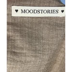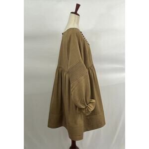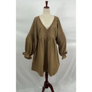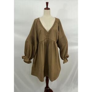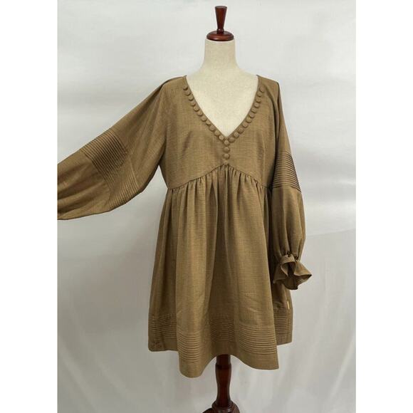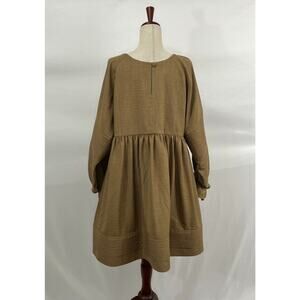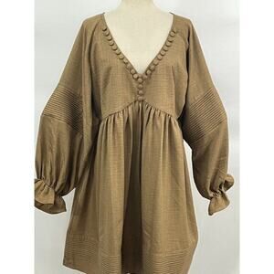 Women's dress by MOODSTORIES. Size One size. No fabric tag. Light brown, dark tan. Long balloon sleeve, faux button detail at neckline, pleated details, Good condition, no stains, holes or pilling