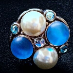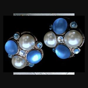 WONDERFUL HUGE 1980’S SAMPLE EARRINGS WITH LARGE BLUE LUCITE MOONSTONES AND PEARLS ACCENTED WITH BLUE SWAROVSKI CRYSTALS..CLIP BACKS ALL MOUNTED ON A LARGE SILVER SETTING..SMART AND COOL, PERFECT AND DRAMATIC ACCENT FOR ANY OCCASION. 1.75” IN DIAMETER..MADE IN SAN FRANCISCO DURING THE FASHION REVOLUTION OF THE 1980’S. EXCELLENT CONDITION READY FOR YOUR NEXT IMPORTANT OCCASION, COLORS ARE WONDERFUL..THE PEARLS ARE WHITE, THEY DO PHOTOGRAPH AS CREAM IN SOME OF THE PHOTOS, BUT PURE WHITE..CLIPBACK