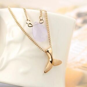 An elegant and delicate multilayered gold tone necklace. The short strand holds a pink moonstone and the longer layer holds a mermaid fin charm. Lobster clasp closure. Pendants are shown next to a penny to indicate size.