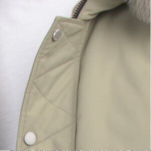 fabric provides stretch, durable material, 2 interior zip pockets, 2 front snap pockets, 1 sleeve pocket, brand logo sleeve detail, faux fur lined hood, shearling trim, ribbed cuffs and hem, quilted accent, water repellent