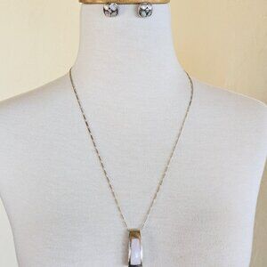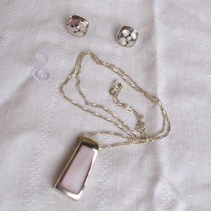 Set of vintage pendant, chain and post earrings in sterling silver and pale pink.