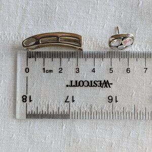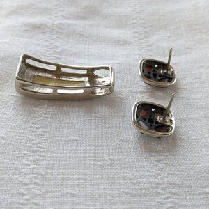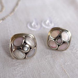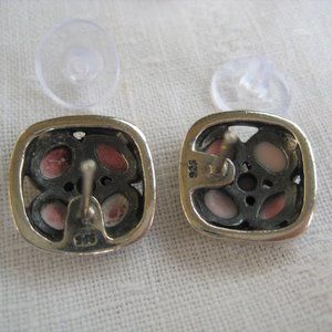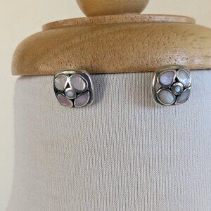 Cluster stud earrings, with new silicone backings, are a lively combination of circle and square, with four round inlaid MOP circles in a square frame. Gems are light in color, but the MOP on one earring is a little faded. Measure 15x15mm, 6 grams, stamped "925" on back.