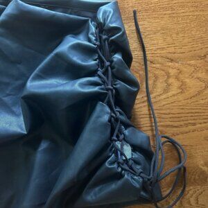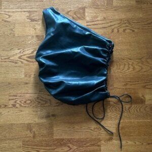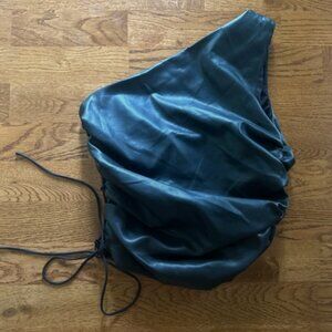 Self: 55% polyester, 45% polyurethane.Lining: 100% polyester. Made in China. Dry clean only. One shoulder styling. Lace-up tie closure at side. Ruched faux leather fabric.