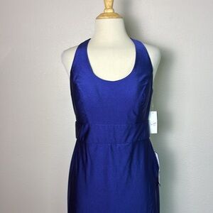 Shimmering satin trades off with your silky skin in stealing the spotlight when you wear this scooped-neck gown with a cutout racerback and a V-cut front hem. This beautiful dress is in excellent new condition with no flaws noted.