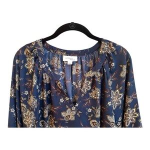 MORGAN TAYLOR, NWOT, WOMENS FLORAL PRINT BLOUSE WITH NAVY BACKGROUND & COLORS OF BROWN & CREAM. ROUND, GATHERED NECKLINE WITH NOTCHED FRONT. FLOWY TOP WITH FULL LONG SLEEVES. SIZE L