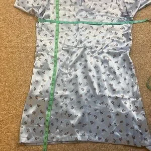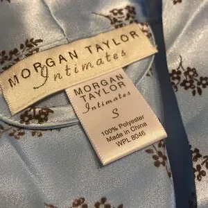 Morgan Taylor V-neck robe has an attach ribbon tie for closure and two side pockets. The robe is a beautiful baby blue with small delicate milk chocolate brown prints.