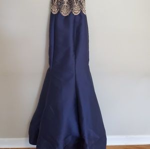 Navy, nude, with navy jewel embellishments. New never been worn long evening gown. Perfect for weddings/formal events/prom. Halter top with one strap down the back.