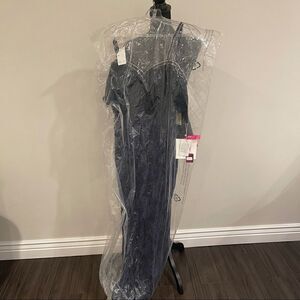 Delicately Beaded Lace Prom Gown Featuring a Romantic Off the Shoulder Flounced Bodice and Illusion Open Back.